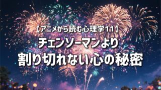 Blog 【アニメから読む心理学11】チェンソーマンより─割り切れない心の秘密 こんにちは、オタクとまでは呼べないアニメ大好きピュシカです。劇場版チェンソーマン レゼ篇観てきました!圧倒的な映像美と、見事なタイミングで入る音楽の数々、そして散りばめられた伏線が、完璧すぎて、アニメというより芸術作品という感じでした。この... 2025.11.24 Blog心理学アニメシリ-ズ